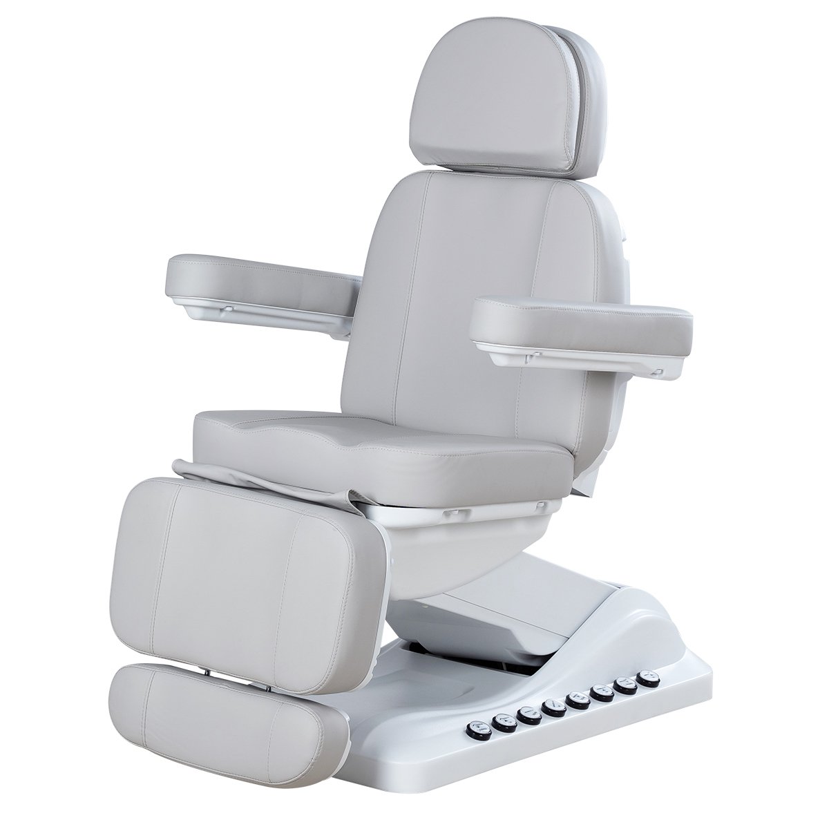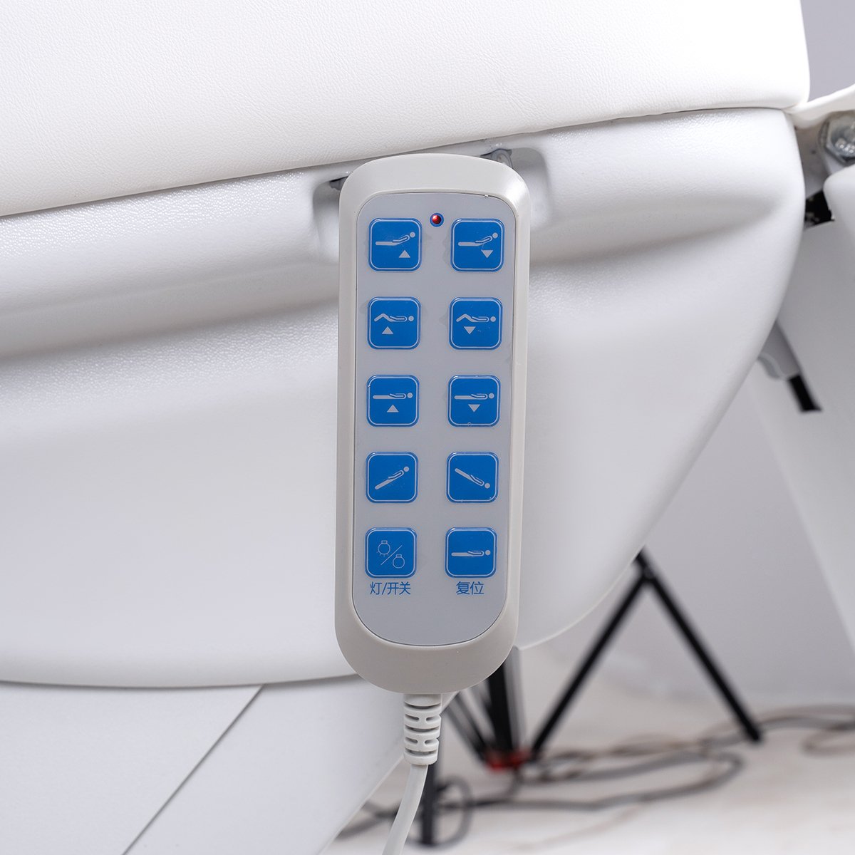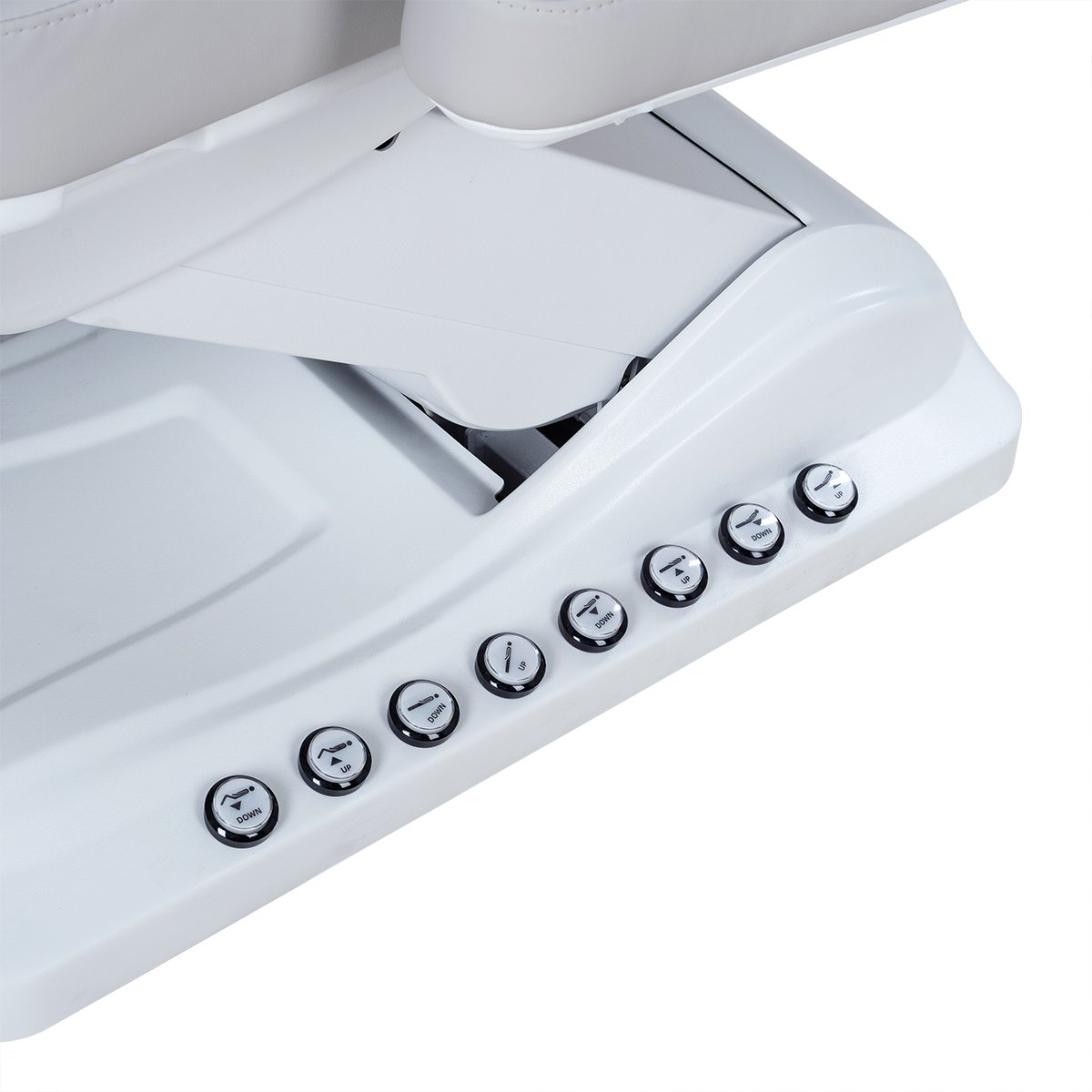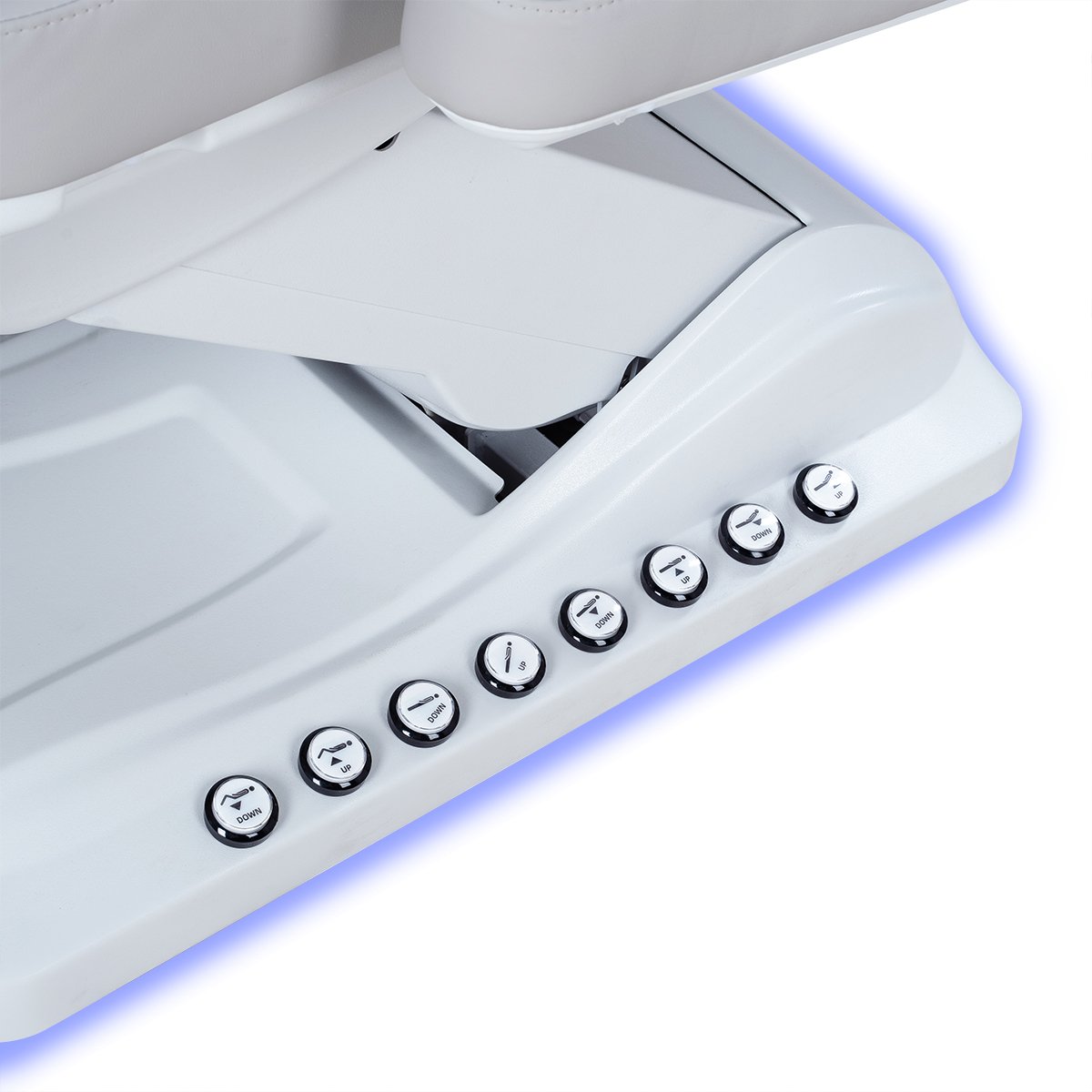 Четыре электромотора обеспечивают плавную и быструю регулировку высоты, наклона кресла, спинки и икроножной части. Инновационный ручной пульт + ножные кнопки с двух сторон кушетки с 9 режимами регулировки. Кроме того, декоративная светодиодная подсветка излучает мягкий свет, дополняющий атмосферу. Все технические детали закрыты пластиком для эстетически красивого вида