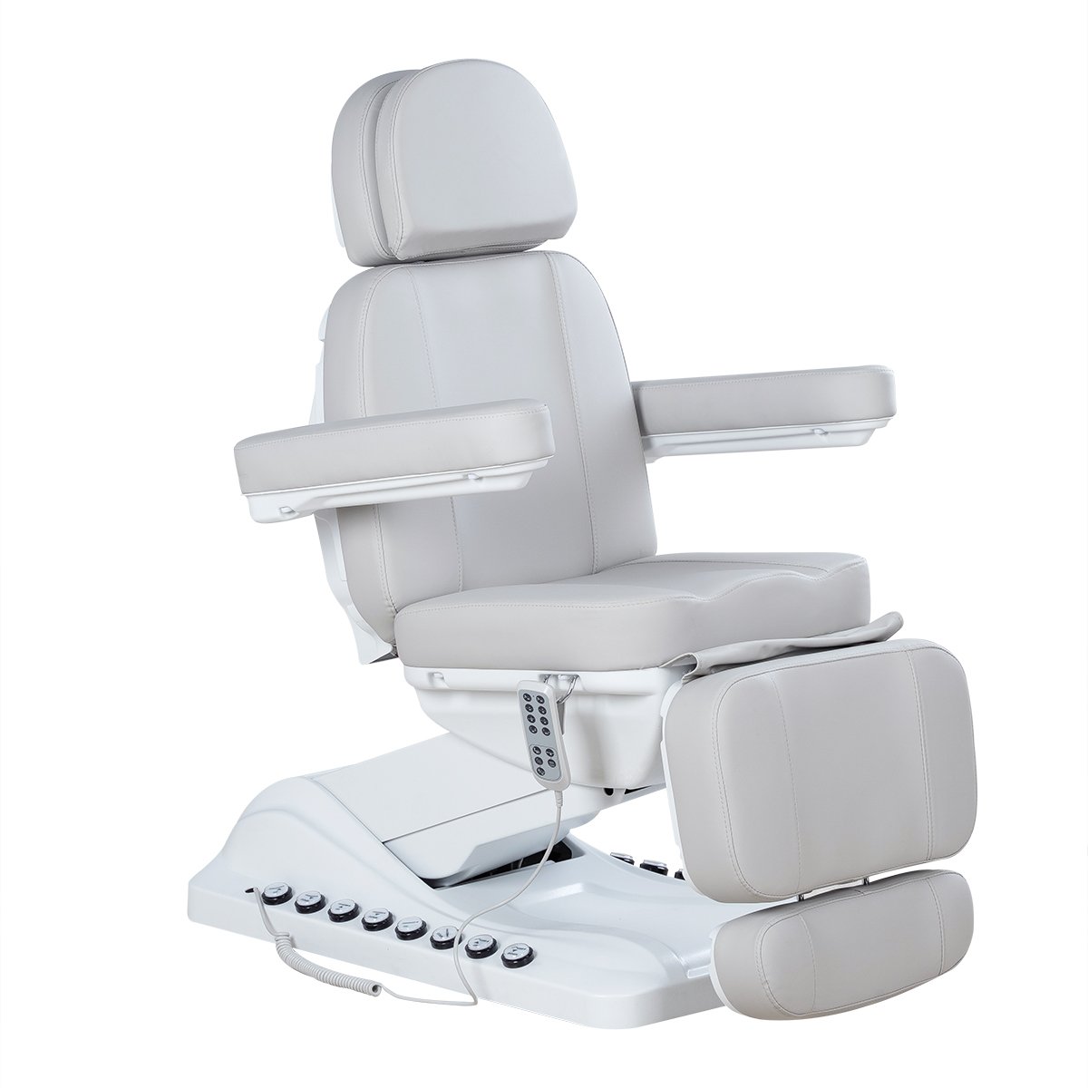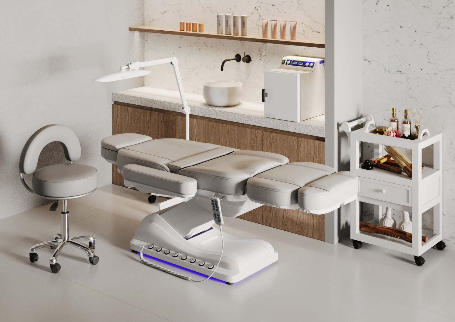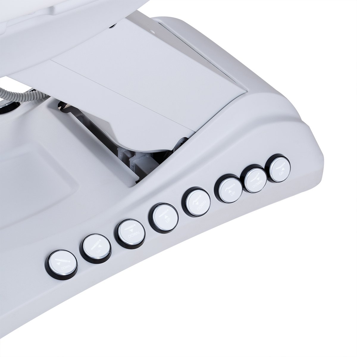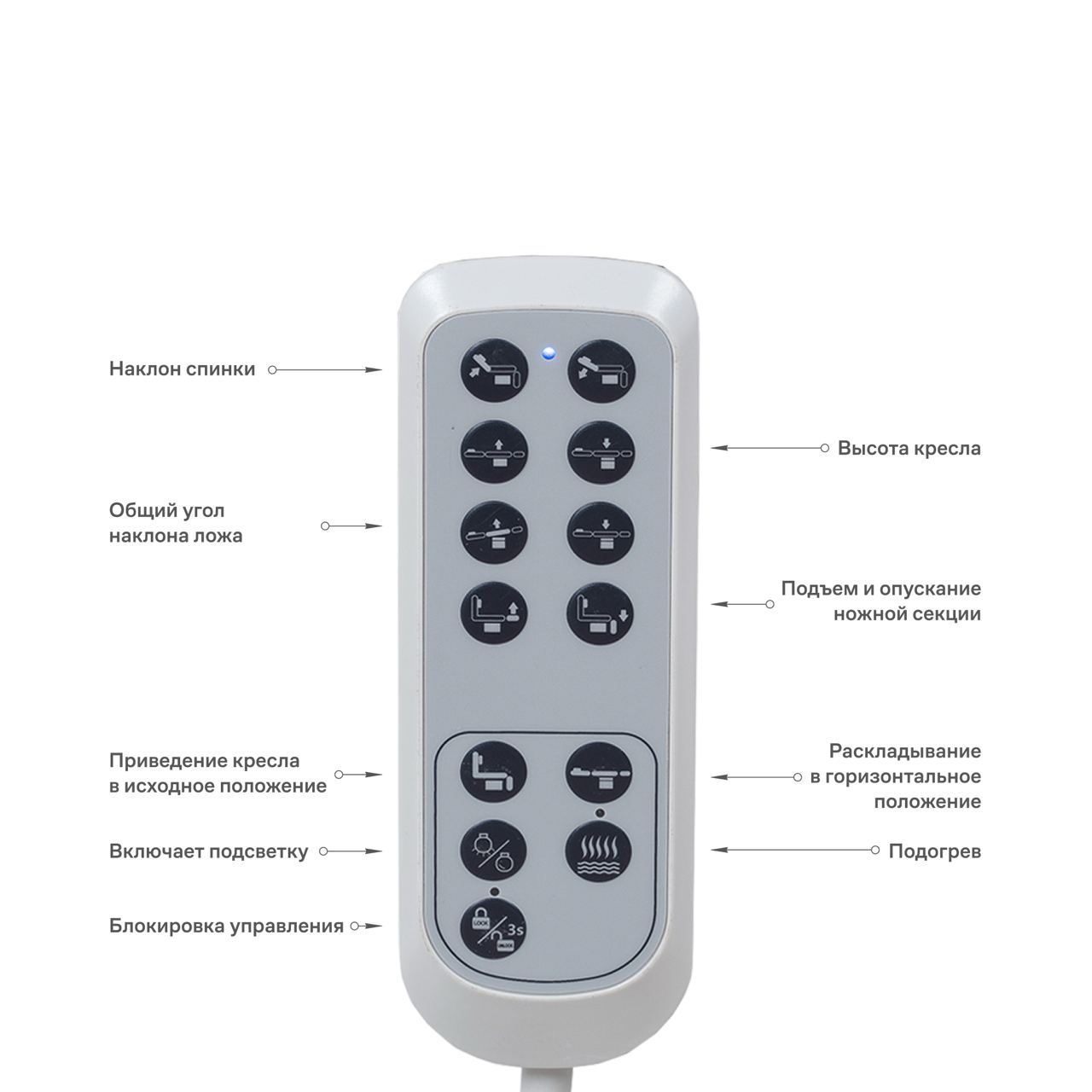 Четыре электромотора обеспечивают плавную и быструю регулировку высоты, наклона кресла, спинки и икроножной части. Инновационный ручной пульт + ножные кнопки с двух сторон кушетки с 9 режимами регулировки. Кроме того, декоративная светодиодная подсветка излучает мягкий свет, дополняющий атмосферу. Все технические детали закрыты пластиком для эстетически красивого вида