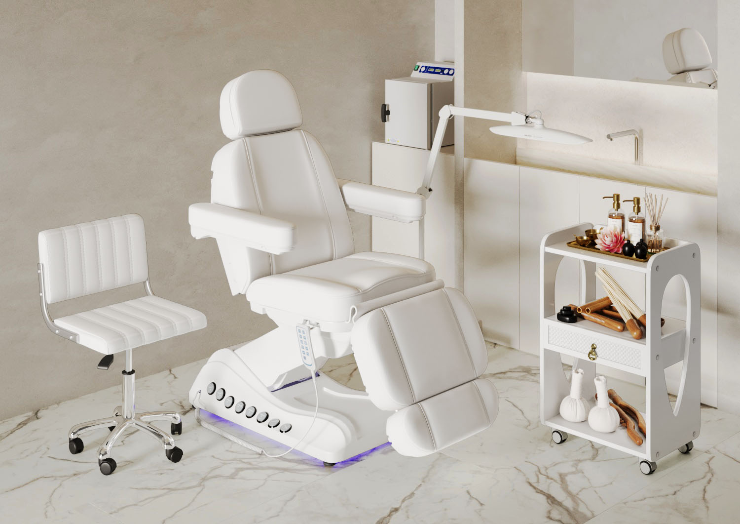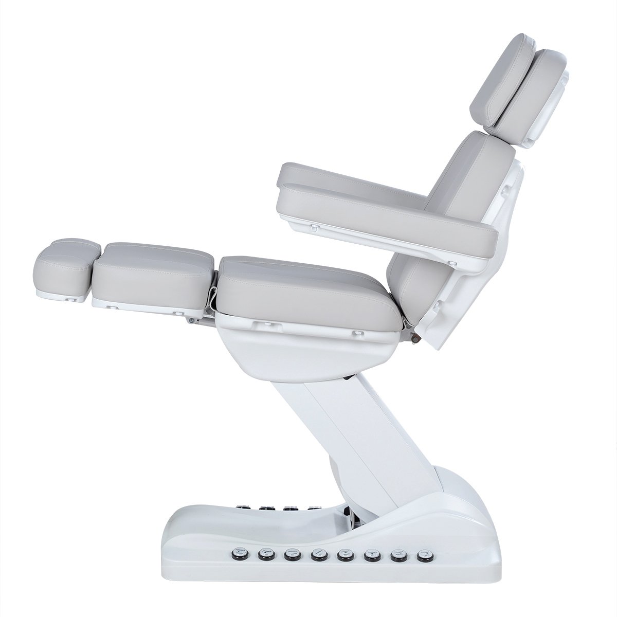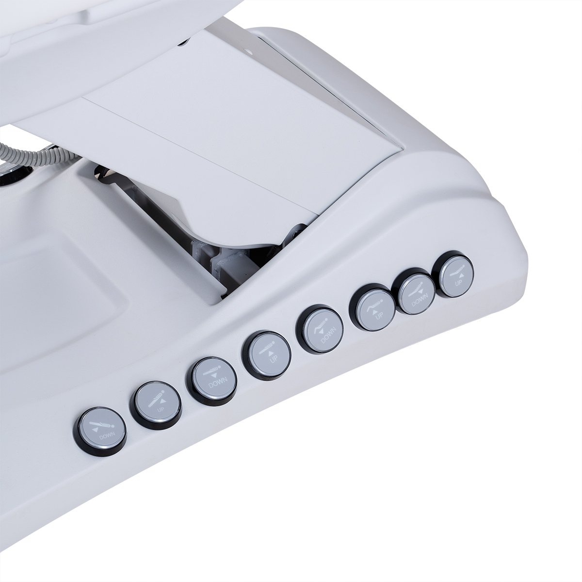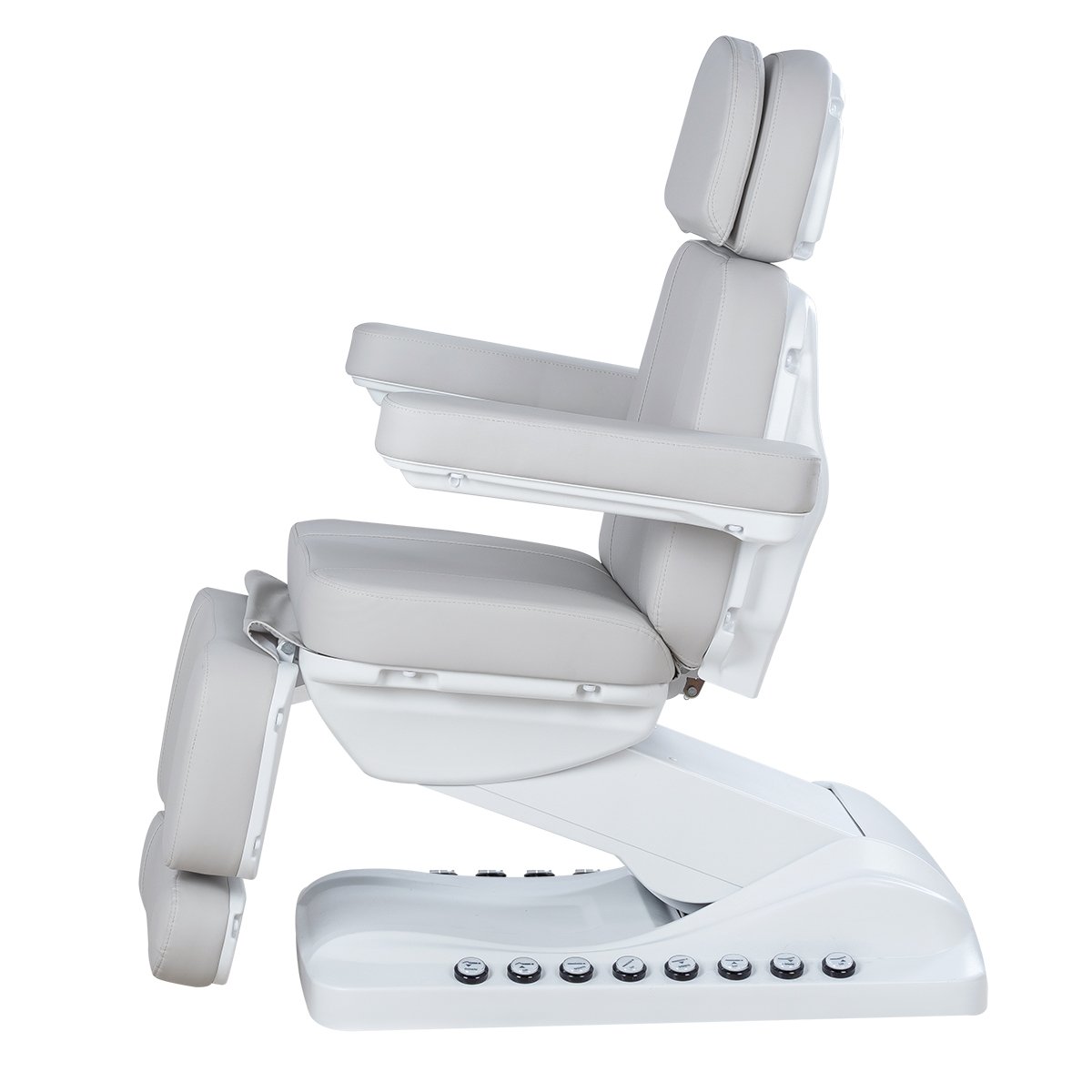 Четыре электромотора обеспечивают плавную и быструю регулировку высоты, наклона кресла, спинки и икроножной части. Инновационный ручной пульт + ножные кнопки с двух сторон кушетки с 9 режимами регулировки. Кроме того, декоративная светодиодная подсветка излучает мягкий свет, дополняющий атмосферу. Все технические детали закрыты пластиком для эстетически красивого вида