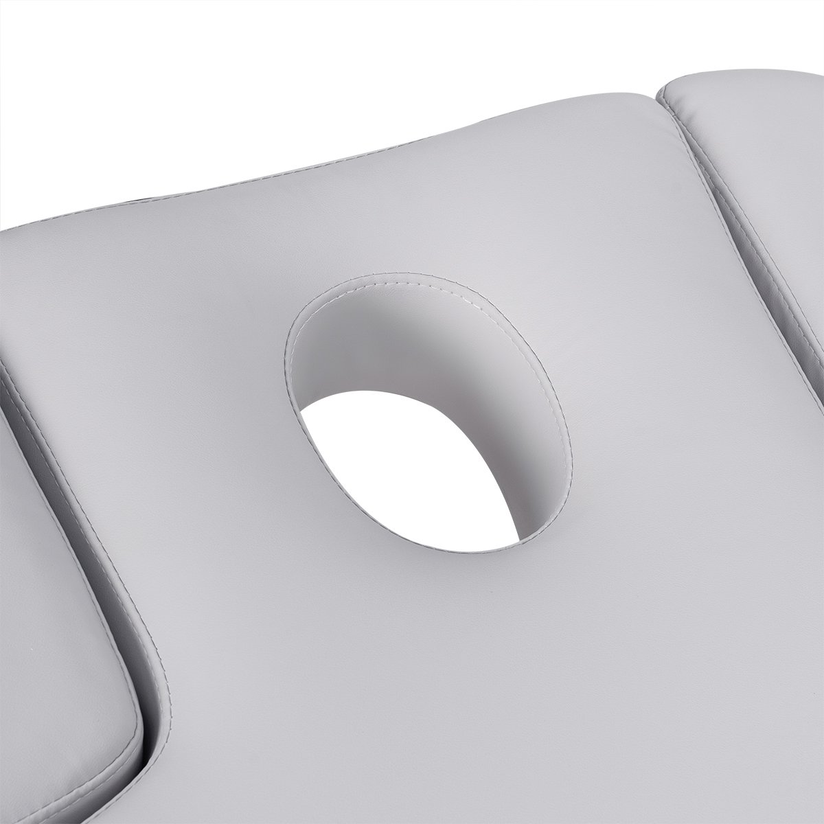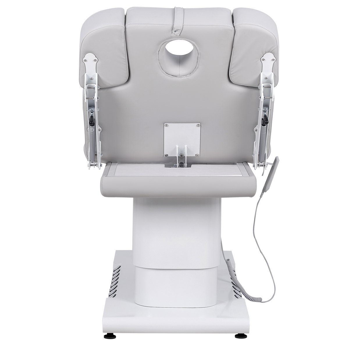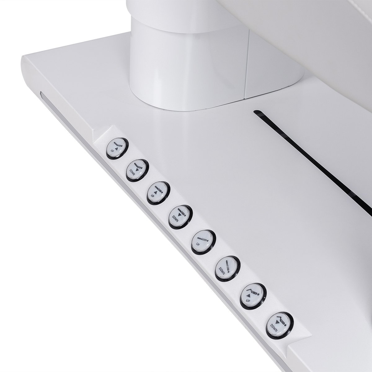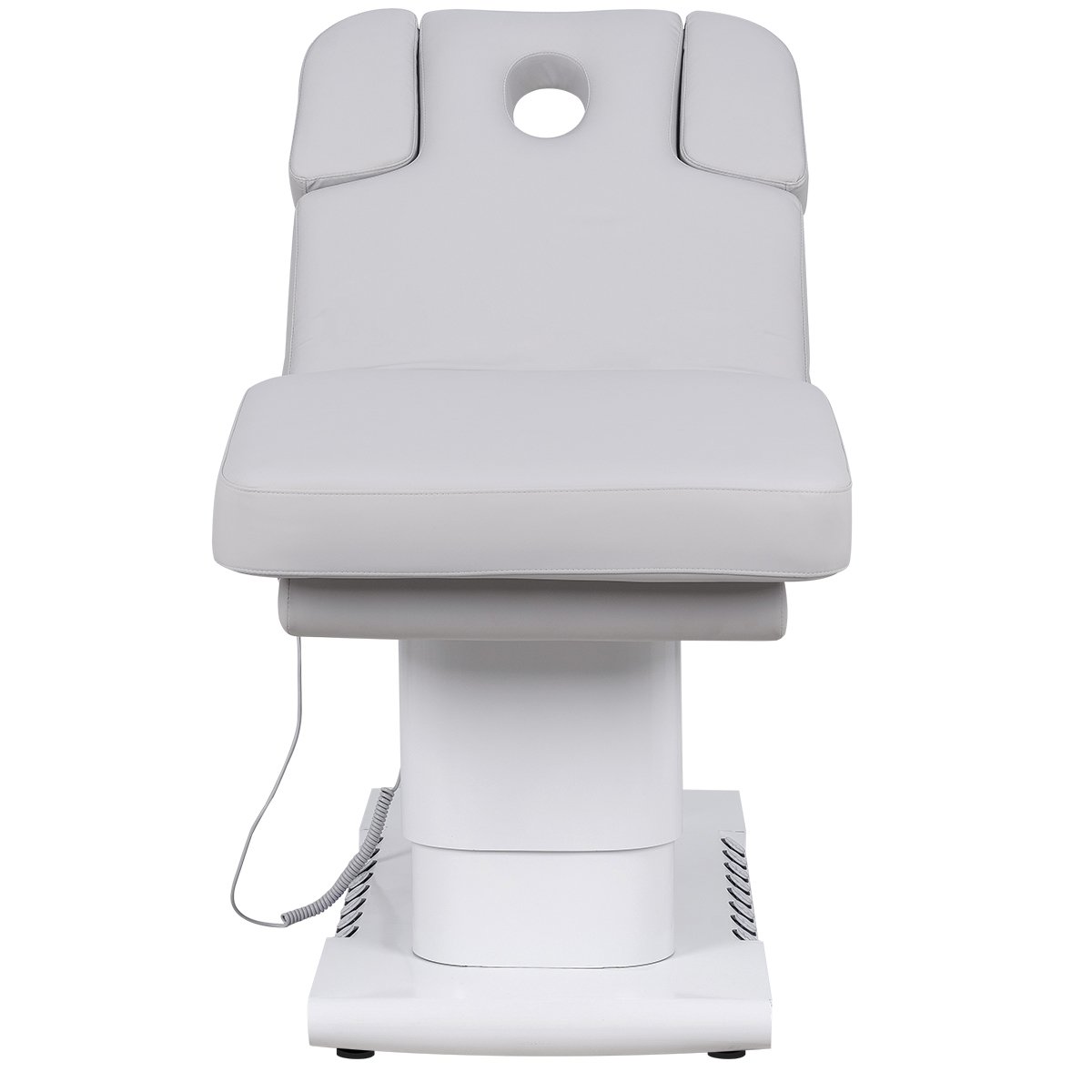 Четыре электромотора обеспечивают плавную и быструю регулировку высоты, наклона кресла, спинки и икроножной части, подголовник оснащен анатомическим отверстием для лица и мягкой подушкой, а регулируемые подлокотники добавят комфорта в положении лёжа на животе. Эко-кожа с упругим наполнителем легко восстанавливает форму даже после длительной нагрузки.