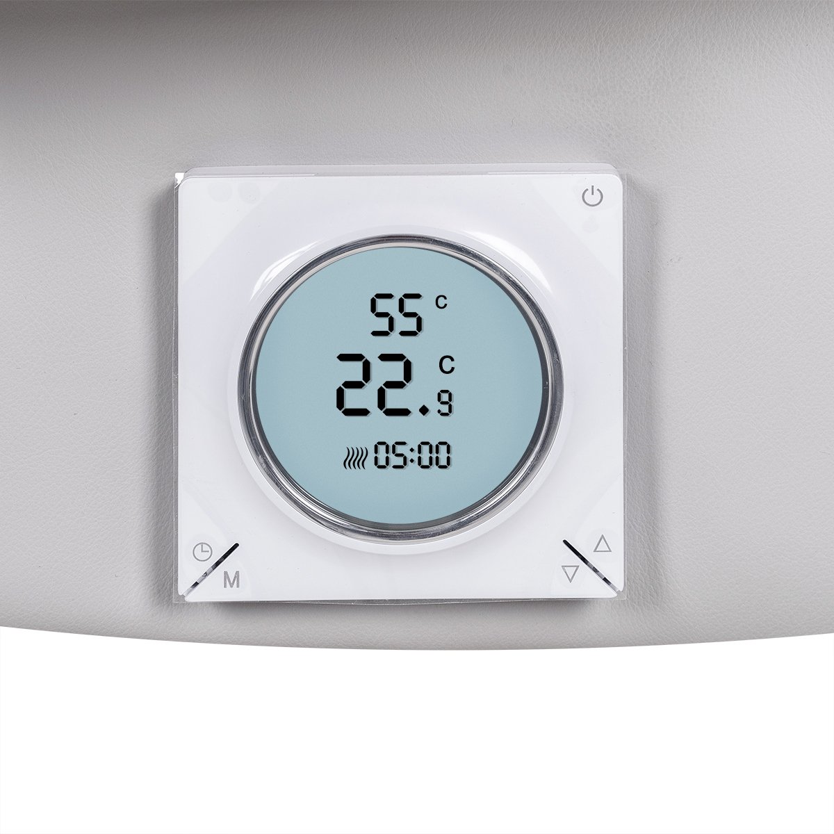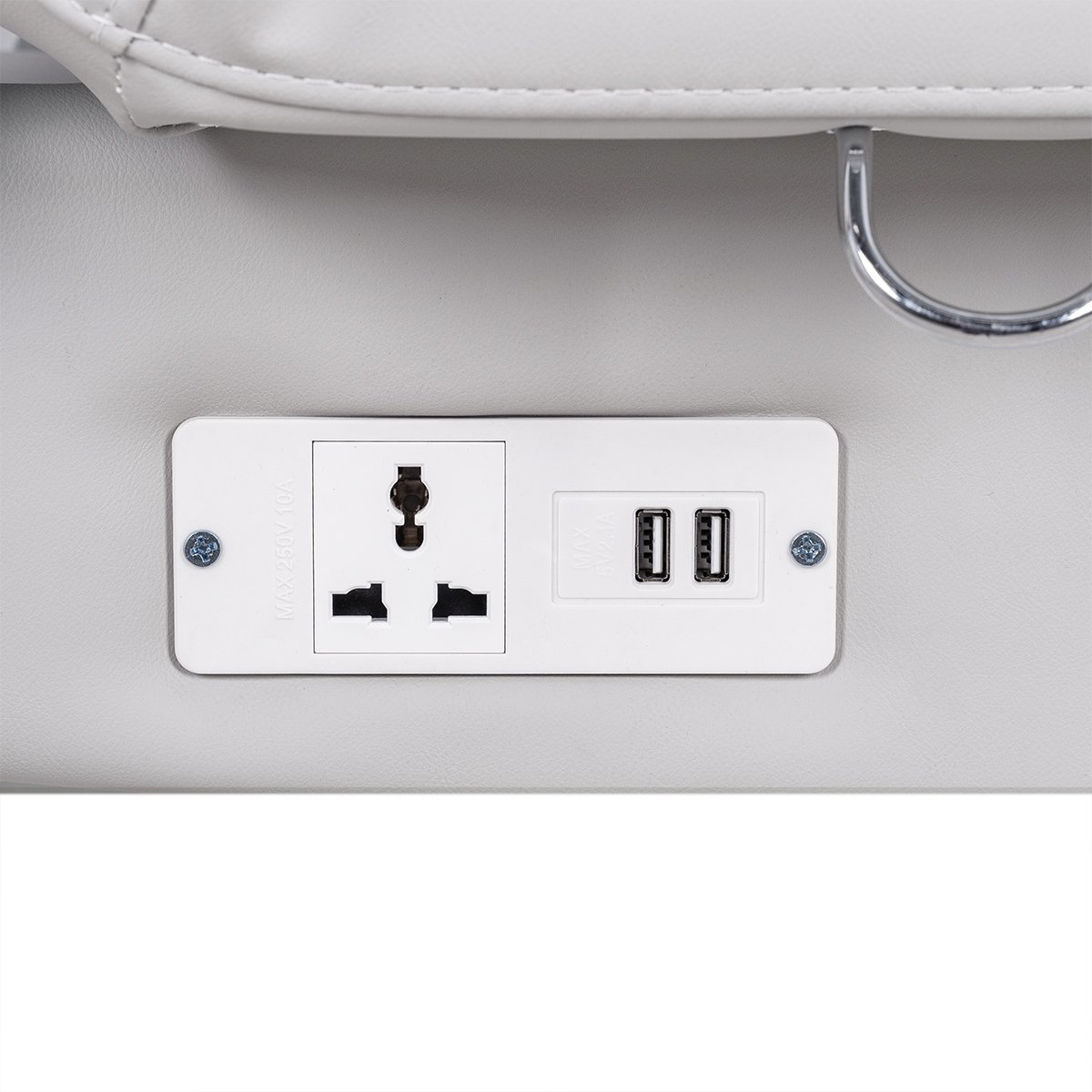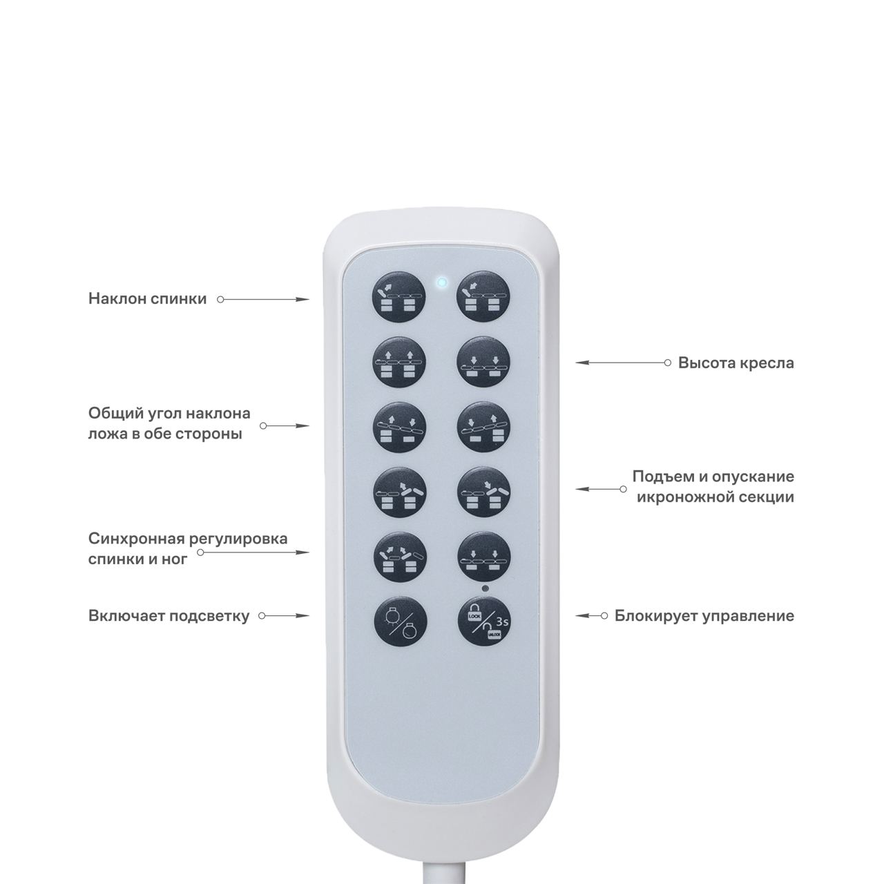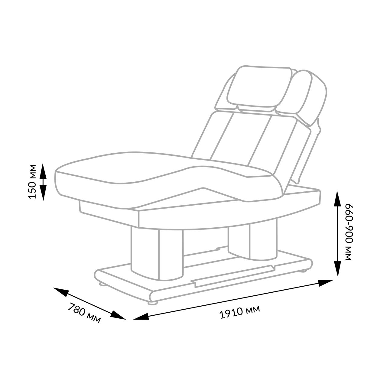 Каркас кушетки оснащен двумя стильными хромированными колоннами, это обеспечивает равномерное распределение нагрузки и устойчивость кушетки. Продуманный инновационный дизайн: электроподогрев ложа с точной настройкой температуры, встроенная розетка и USB-разъёмы, а также подсветка, создающая атмосферу уюта. Инновационная система управления с классическим ручным пультом и удобными ножными кнопками с обеих сторон кушетки — 7 режимов.