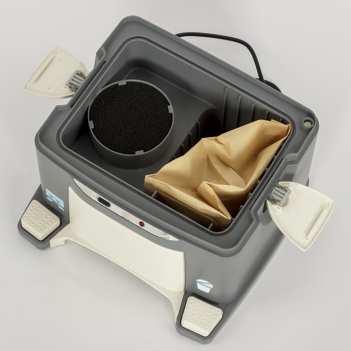 Парикмахерское оборудование оснащено съемным контейнером для мусора объемом 15 литров, в котором с легкостью крепятся сменные пакеты. Благодаря его вместительности не нужно очищать мешок после каждой уборки. В конструкции предусмотрен световой индикатор, напоминающий о необходимости сменить бумажный фильтр.
