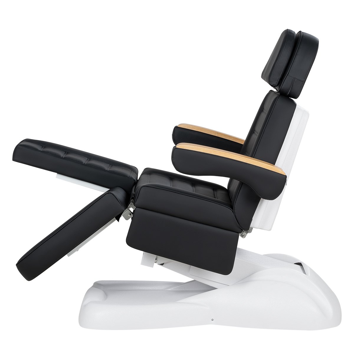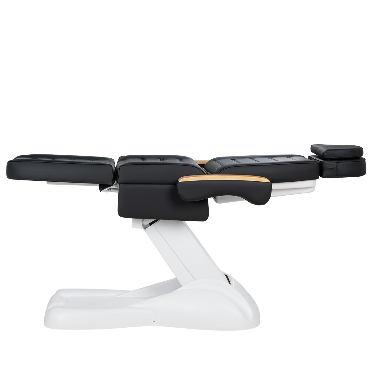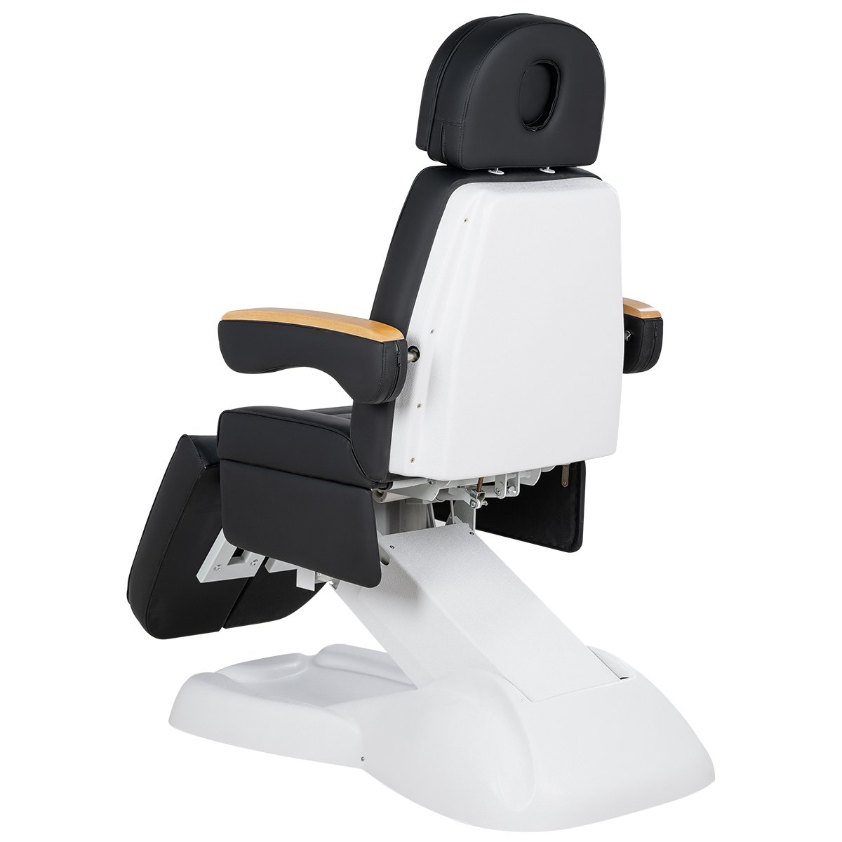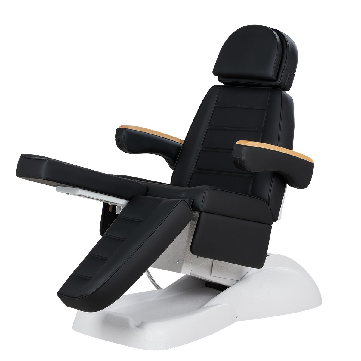 Кресло имеет устойчивое широкое основание, конструкция полностью раскладывается в горизонтальное положение, имеются выдвижной подголовник с отверстием для лица, которое при необходимости можно закрыть мягкой подушкой и съёмные подлокотники со стильными деревянными вставками. Модель можно использовать для различных процедур: педикюр, наращивание ресниц, косметология, оформление бровей и т.д.