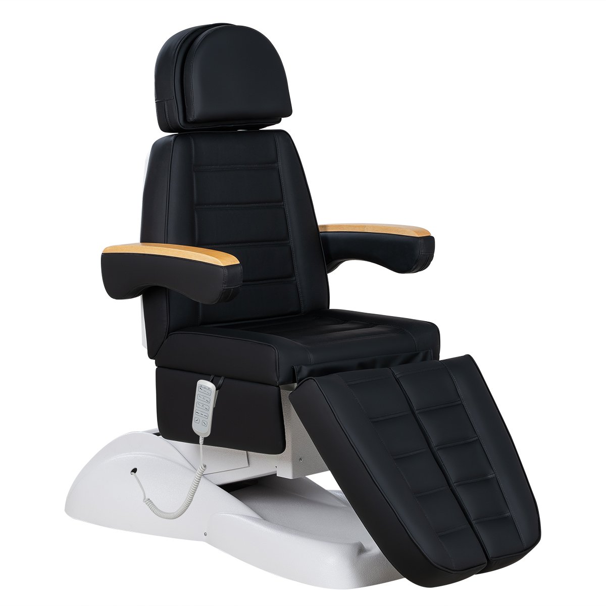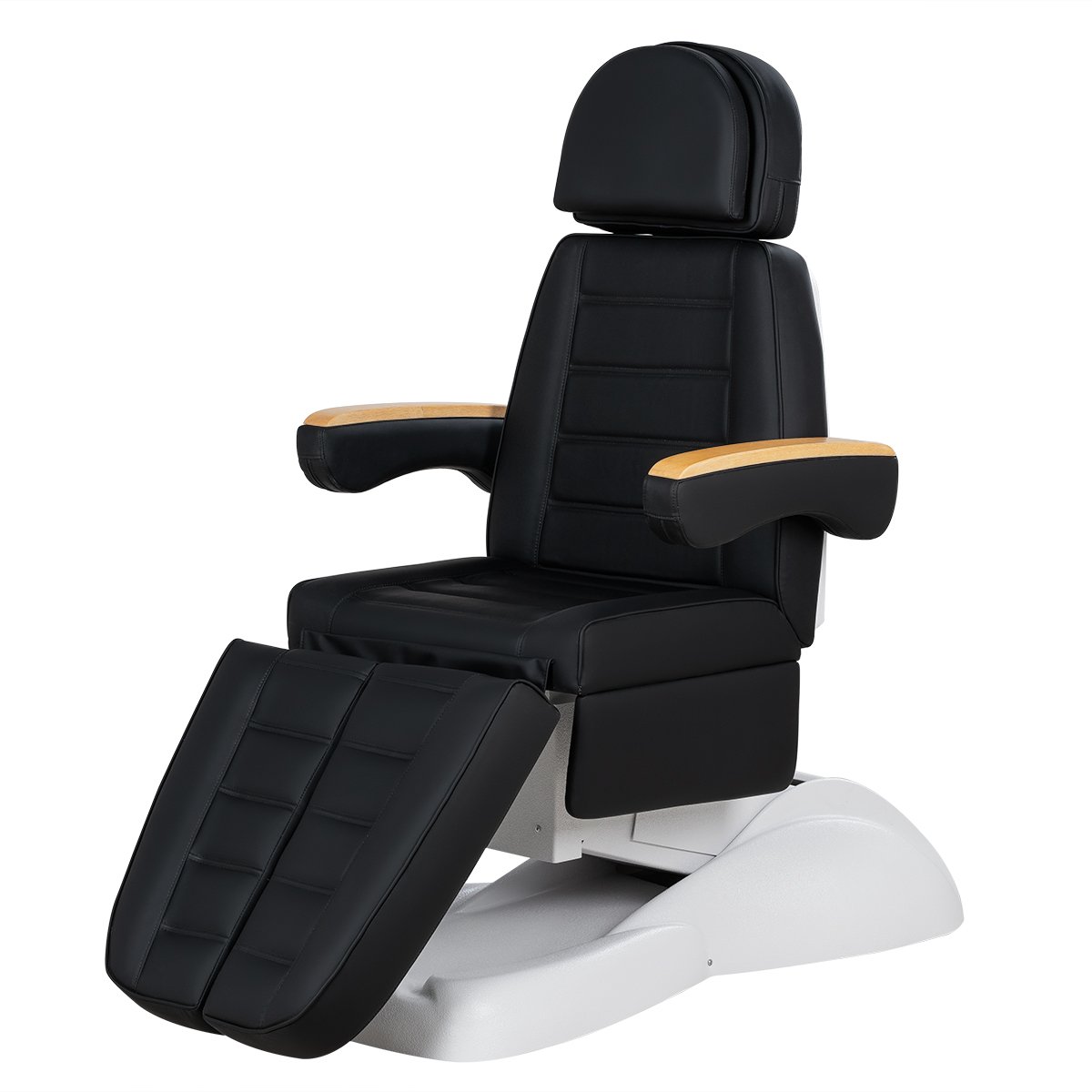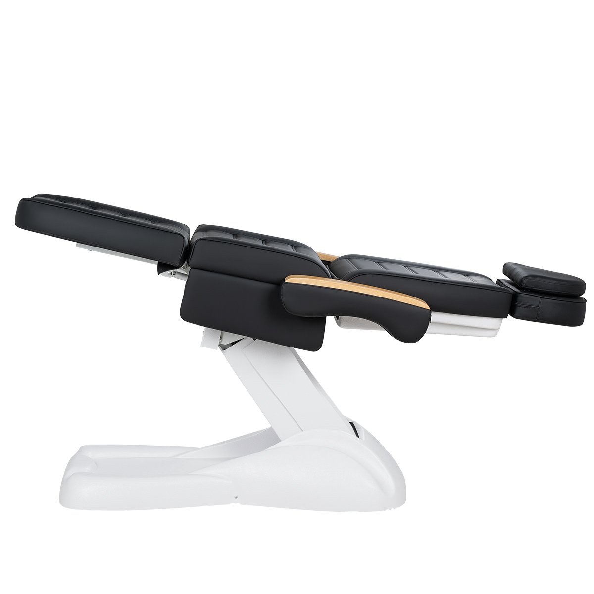 Кресло имеет устойчивое широкое основание, конструкция полностью раскладывается в горизонтальное положение, имеются выдвижной подголовник с отверстием для лица, которое при необходимости можно закрыть мягкой подушкой и съёмные подлокотники со стильными деревянными вставками. Модель можно использовать для различных процедур: педикюр, наращивание ресниц, косметология, оформление бровей и т.д.