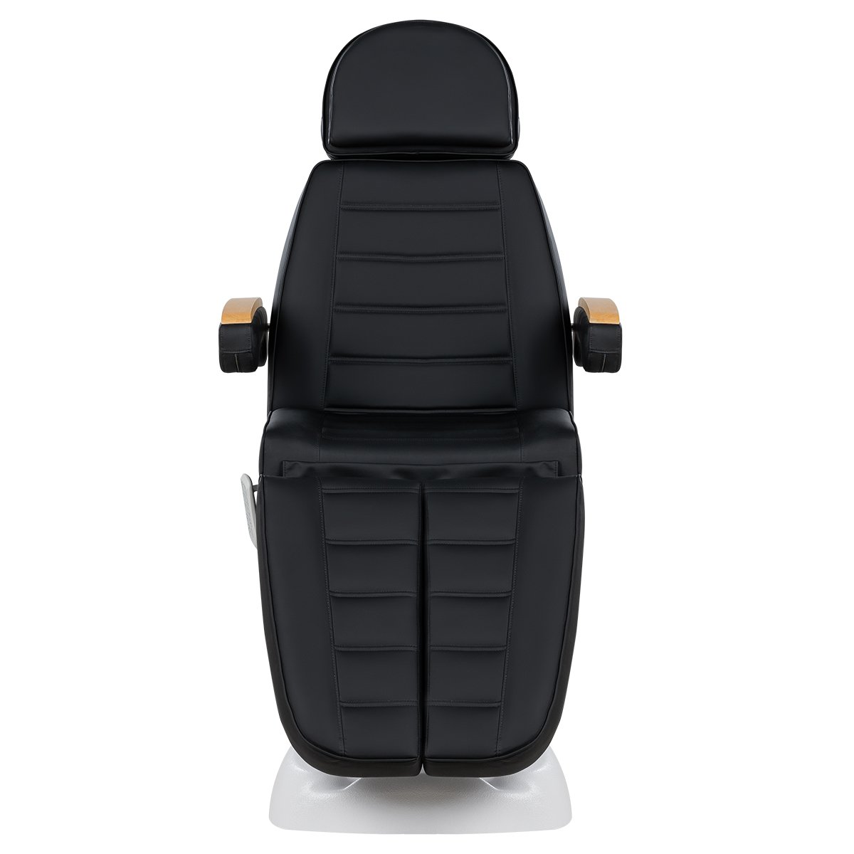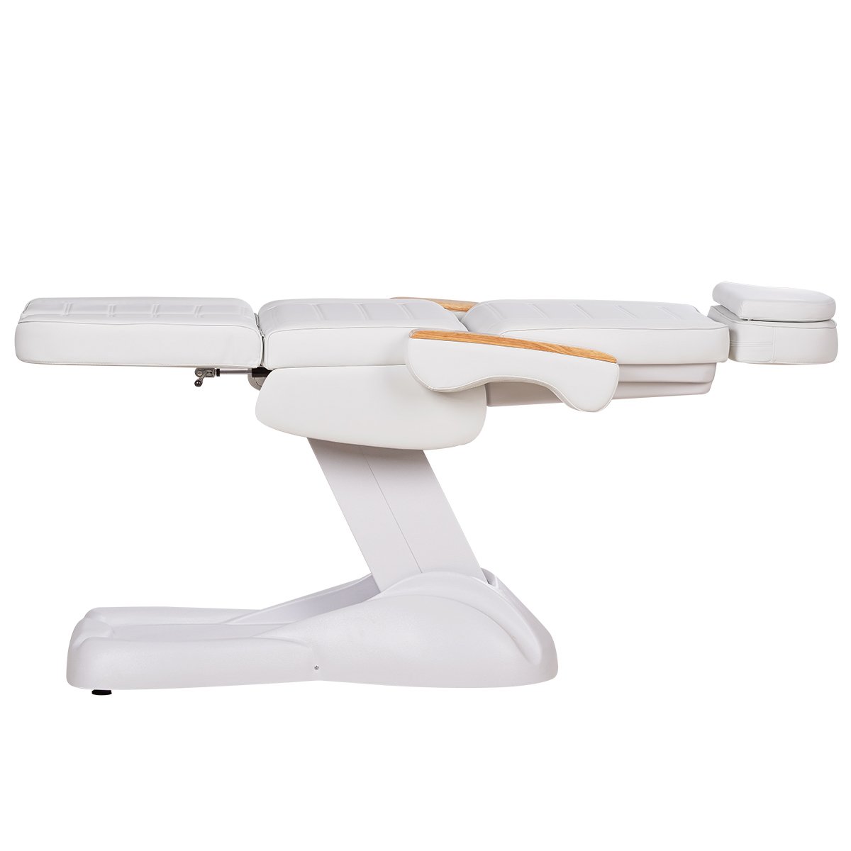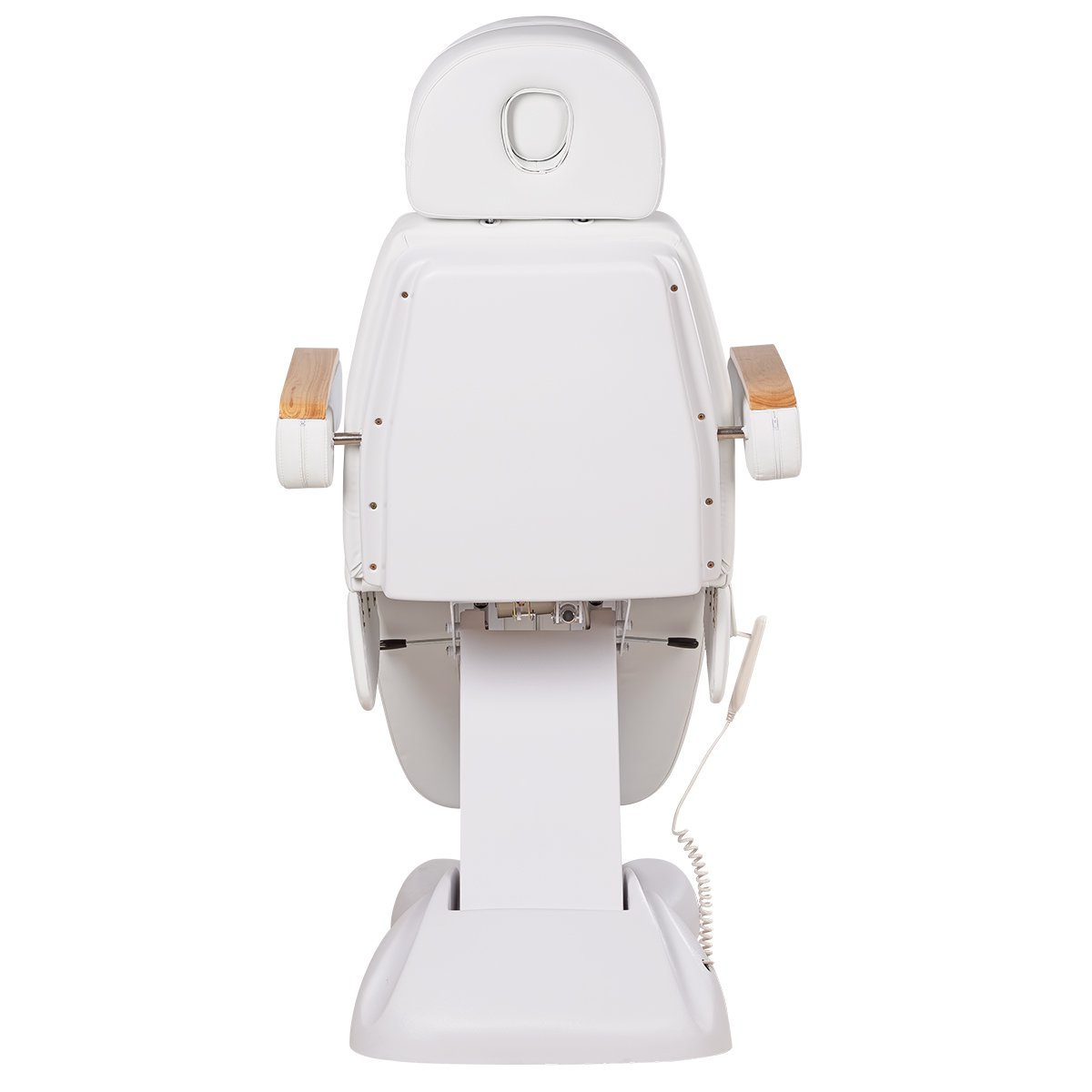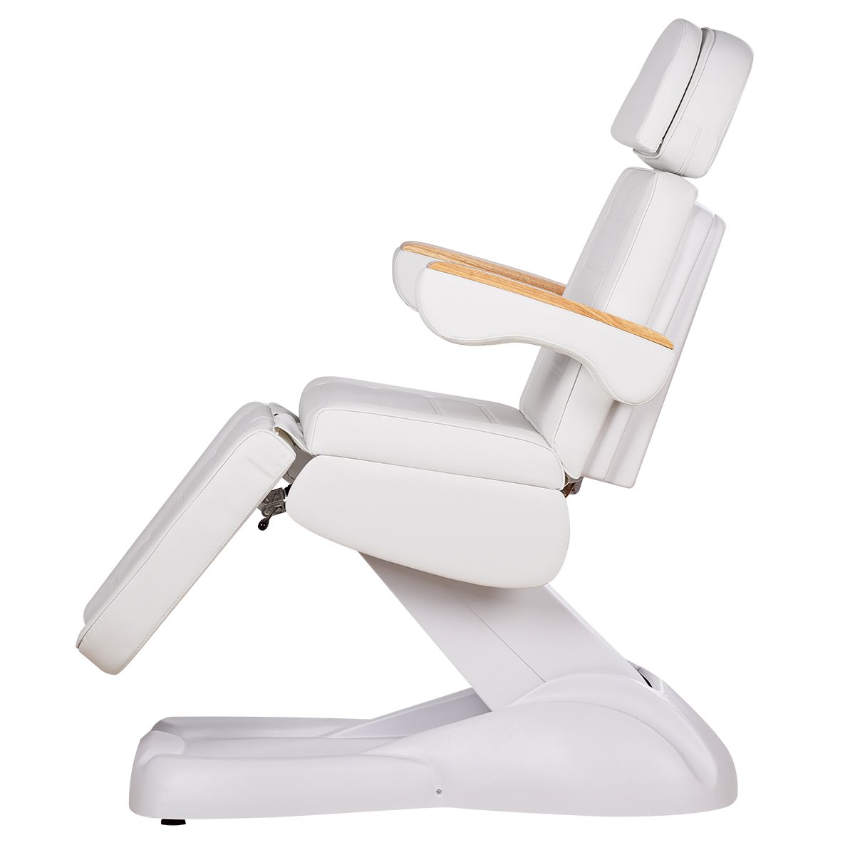 Кресло имеет устойчивое широкое основание, конструкция полностью раскладывается в горизонтальное положение, имеются выдвижной подголовник с отверстием для лица, которое при необходимости можно закрыть мягкой подушкой и съёмные подлокотники со стильными деревянными вставками. Модель можно использовать для различных процедур: педикюр, наращивание ресниц, косметология, оформление бровей и т.д.