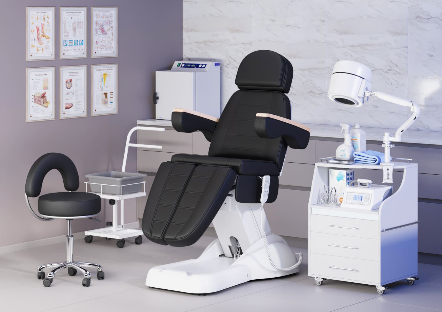 Педикюрное кресло МД-144А сочетает в себе стиль, европейский дизайн, удобство и надёжность. В таком кресле каждый клиент сможет насладиться процедурой в комфортных условиях. Регулировка спинки, высоты, угла наклона кресла и положение ног осуществляется пятью электромоторами с помощью пульта, что позволяет быстро и с комфортом для клиента менять положение мягких элементов.